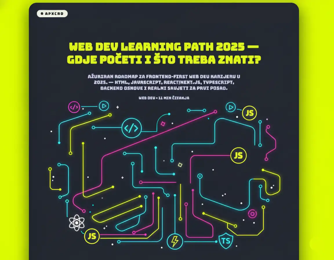 Ažuriran roadmap za frontend-first web dev karijeru u 2025. — HTML, JavaScript, React/Next.js, TypeScript, backend osnove i realni savjeti za prvi posao.